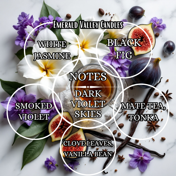 Dark Violet Skies is an alluring fragrance that captures the mystery of twilight. It opens with delicate white jasmine and the lush sweetness of black fig, drawing you in with soft sophistication. At the heart, a blend of smoked violet, earthy mate tea, and warm tonka creates a rich, velvety depth. Finally, the scent lingers with the subtle spice of clove leaves and the comforting warmth of vanilla bean, wrapping the senses in a dark, dreamy embrace.